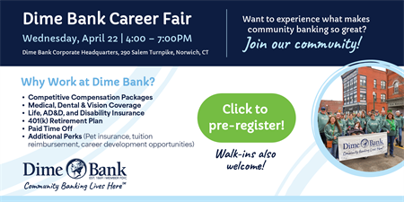 Dime Bank is hosting a career fair on Wednesday, April 22 from 4:00pm - 7:00pm at our recently renovated corporate office located at 290 Salem Turnpike, Norwich, CT.