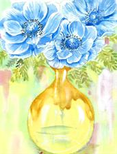 The workshop begins with a watercolor warm-up and demonstrations showing specific techniques needed to accomplish completed paintings. Wet on wet, wet on dry, layering/glazing and brush stroke techniques are part of building skills. The class approaches watercolor using graphic illustration with an emphasis on fun! Each class offers a different theme/inspiration with references supplied.Anemones in a Vase